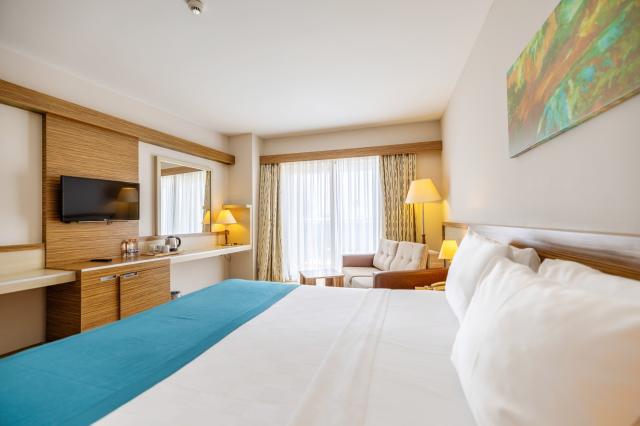 Turgutreis. Hotel disponuje privátní pláží a několika bazény. Zázemí hotela je ideální pro rodinnou dovolenou. |